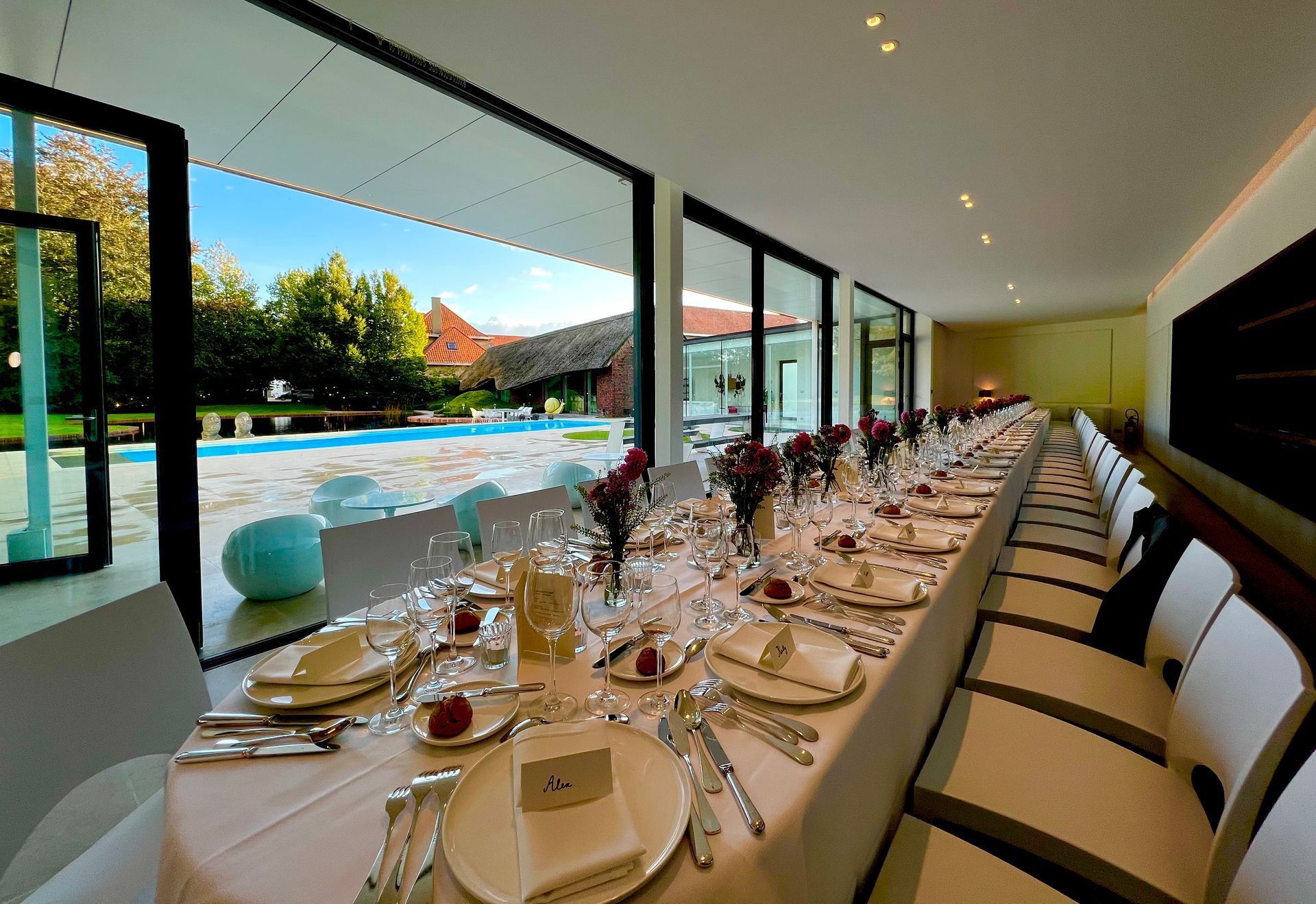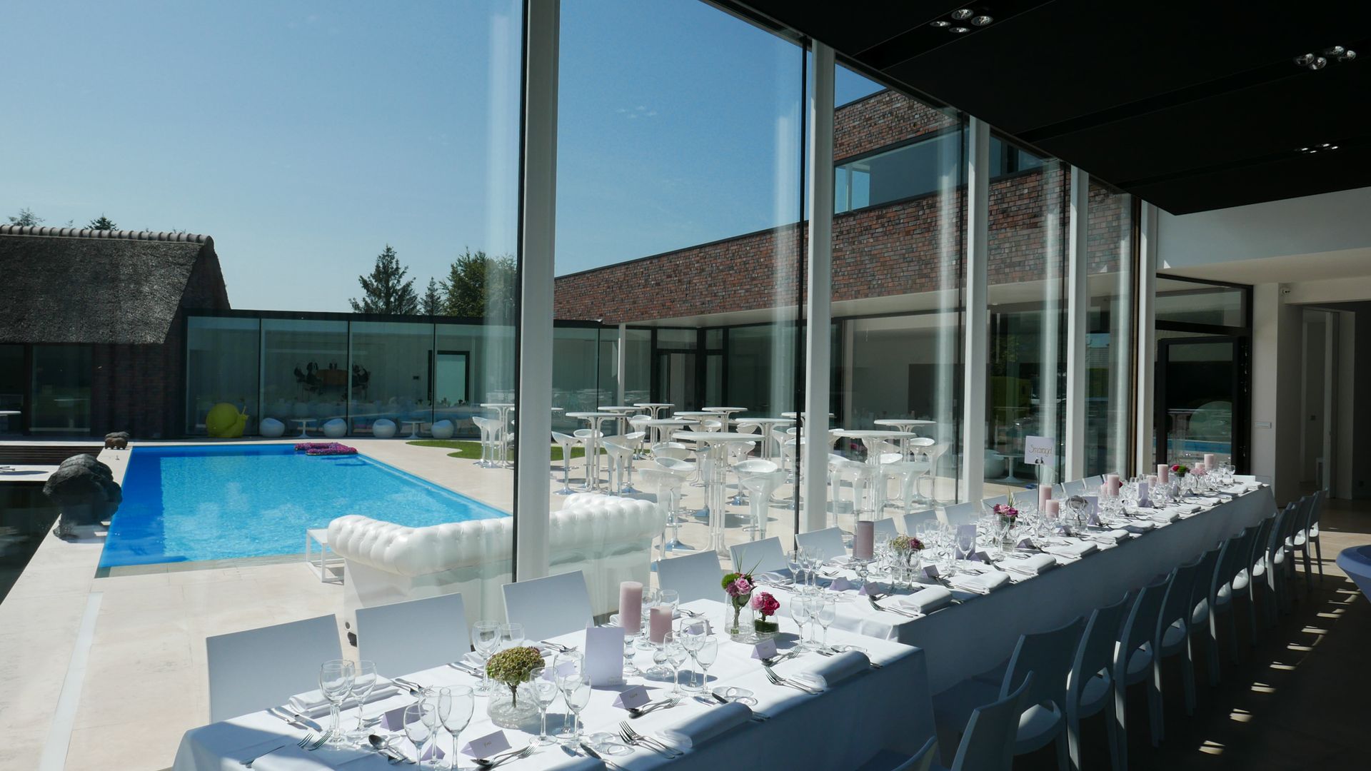 Onze moderne villa met lounge, open haard en stijlvolle bar vormt het kloppende hart van elk evenement.