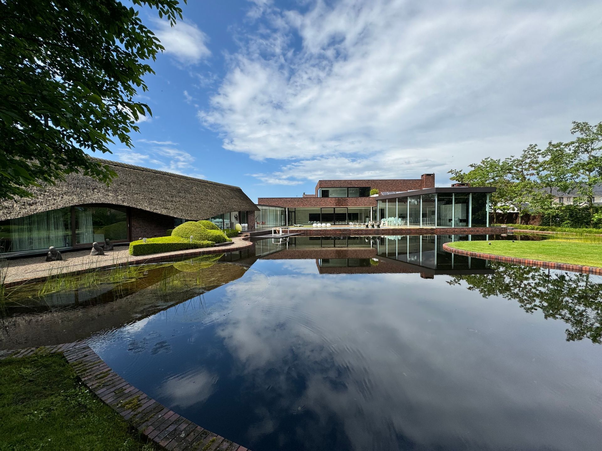 De grote glaspartijen verbinden binnen en buiten: het ruime terras, het verwarmde zwembad, de ecologische zwemvijver en de 6000 m² parktuin creëren een decor dat inspireert én ontspant.